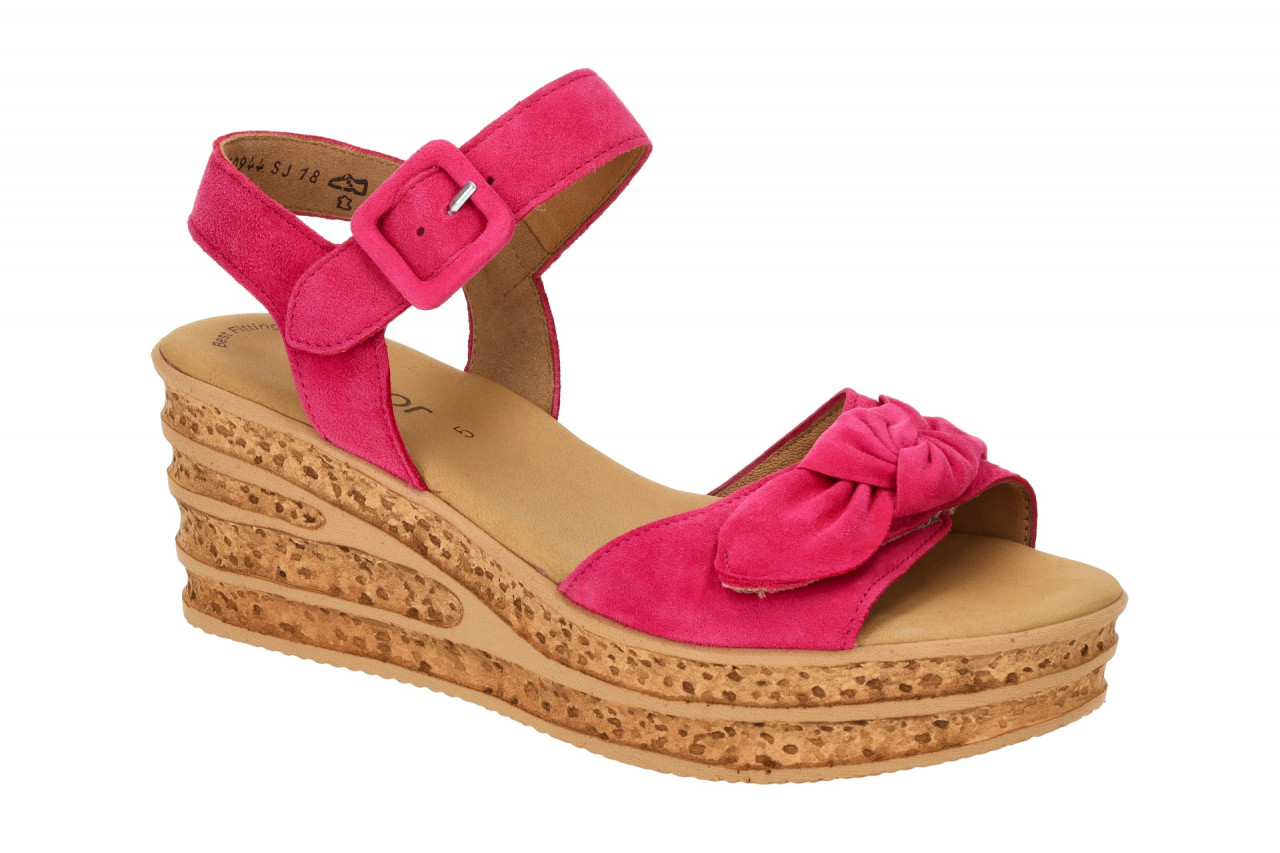 Hersteller: Gabor Hersteller Art-Nr.: 64.653.10 Modellname: 64.653 – GABOR Best Fitting Machart: Damen Sandalette – Riemchen Sandalen Farbe: pink + Sohle in braun (pink) Obermaterial: Echtleder – Velour – Rauhleder (Samtchevreau) Innenfutter: Echtleder Innensohle: Echtleder – Fu?bett, Polsterbrandsohle Wechselfu?bett: nicht herausnehmbare Innensohle Laufsohle: Polyurethan (PU) – extra leicht und flexibel, Plateau ca. 3cm Verschluss: Klettverschluss Absatzart: Keilabsatz / Wedge, Keil ca. 3,5cm Absatzh?he: flach Schuhform: rund Gr??enhinweis: f?llt normal aus Weitenangabe: F – normal Weite Herstellerinformationen Gabor Shoes GmbH | Joachim-Gabor-Platz 1, 83024 Rosenheim Kontakt: info@gabor.de | 0049 8031 801-0 interne Artikelnummer f?r Ihre R?ckfragen: 289-54-0003