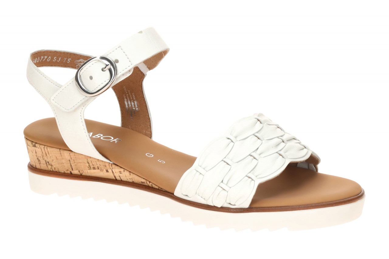 Hersteller: Gabor Hersteller Art-Nr.: 82.758.50 Modellname: 82.758 Machart: Damen Sandalette – Riemchen Sandalen Farbe: wei? + braun (weiss (Kork)) Obermaterial: Echtleder – Glattleder (Lammnappa) Innenfutter: Textil Innensohle: Echtleder – Fu?bett Wechselfu?bett: nicht herausnehmbare Innensohle Laufsohle: Gummisohle Verschluss: Klettverschluss Absatzart: Keilabsatz / Wedge, Keil ca. 2,5cm aus nachhaltigem Kork Absatzh?he: flach Schuhform: rund Gr??enhinweis: f?llt normal aus Weitenangabe: G – normal Weite Herstellerinformationen Gabor Shoes GmbH | Joachim-Gabor-Platz 1, 83024 Rosenheim Kontakt: info@gabor.de | 0049 8031 801-0 interne Artikelnummer f?r Ihre R?ckfragen: 288-10-0126