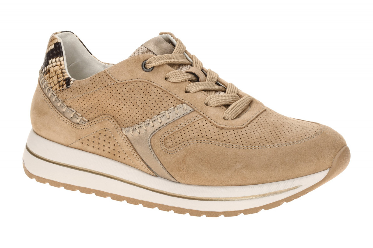 Hersteller: Gabor Hersteller Art-Nr.: 86.336.34 Modellname: DAVOS Machart: Damenschuhe – Halbschuhe – Sneaker Farbe: hellbraun + beige metallic + Sohle in creme-wei? + gold + hellbraun (sand/mutaro) Obermaterial: Velourleder + Glattleder Mix (Samt, Perl, Python – perforiert) Innenfutter: Echtleder und Textil Innensohle: Synthetik Fu?bett, Gabor – OptiFit Wechselfu?bett: Ja mit 2 Innensohlen – variable Pa?form Laufsohle: Gummisohle Verschluss: Schn?rung und Rei?verschluss Absatzart: flach – kein Absatz Schuhform: rund Gr??enhinweis: f?llt normal aus Weitenangabe: H – Extra Weit Herstellerinformationen Gabor Shoes GmbH | Joachim-Gabor-Platz 1, 83024 Rosenheim Kontakt: info@gabor.de | 0049 8031 801-0 interne Artikelnummer f?r Ihre R?ckfragen: 238-36-0030
