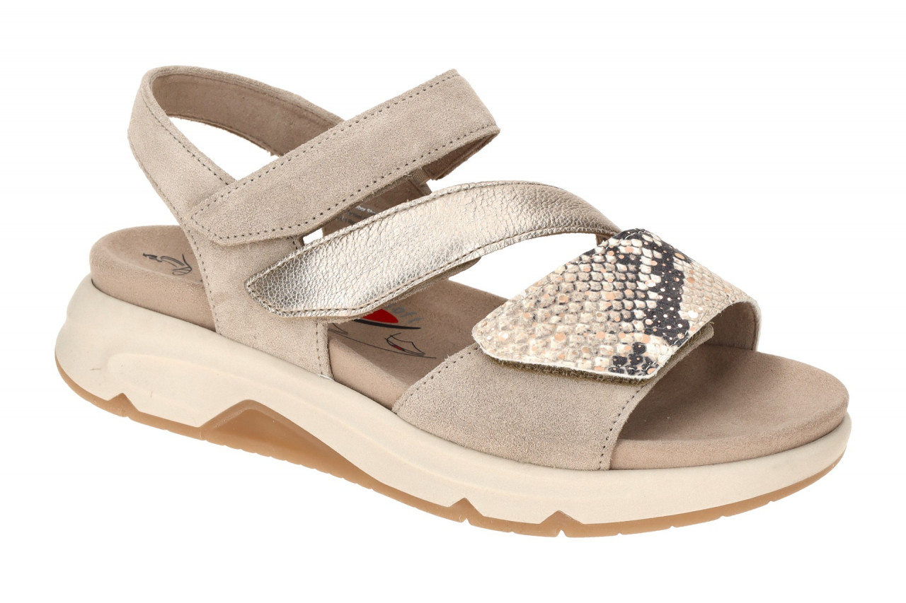 Hersteller: Gabor Hersteller Art-Nr.: 86.882.63 Modellname: ROLLINGSOFT Machart: Damen Sandale – Sandaletten Farbe: grau + beige + hell-gold metallic (pesca / puder / oasi) Obermaterial: Glattleder + Velourleder Mix (Snake / Cervo Metallic / Velour) Innenfutter: Textil Innensohle: Textil Fu?bett Wechselfu?bett: Ja – herausnehmbare Innensohle Laufsohle: Gummisohle Verschluss: Klettverschluss, 3fach Absatzart: Keilabsatz / Wedge, Keil 1,5cm Schuhform: rund Gr??enhinweis: f?llt normal aus Weitenangabe: G – normal Weite Herstellerinformationen Gabor Shoes GmbH | Joachim-Gabor-Platz 1, 83024 Rosenheim Kontakt: info@gabor.de | 0049 8031 801-0 interne Artikelnummer f?r Ihre R?ckfragen: 288-20-0046