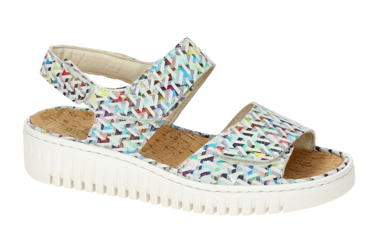Hersteller: Waldl?ufer Hersteller Art-Nr.: 955001 152 299 Modellname: H-WILLOW Machart: Damen Sandale – Sandaletten Farbe: hellgrau + buntes Lack-Print Muster (multi) Obermaterial: Echtleder – Velour – Rauhleder (Stoner, 3D Lack-Print) Innenfutter: Echtleder – d?nnes Leder Kaltfutter Innensohle: Kork Fu?bett, Kork bezogen Wechselfu?bett: Ja – herausnehmbare Innensohle Laufsohle: Gummisohle, extrem flexibel Verschluss: Klettverschluss, 3fach Klett Absatzart: Keilabsatz / Wedge, Keil ca. 2cm Absatzh?he: flach Schuhform: rund Gr??enhinweis: f?llt normal aus Weitenangabe: H – Extra Weit Herstellerinformationen Lugina Schuhfabrik GmbH | (Wasgaustra?e 2A, 76848 Schwanheim/Pfalz Kontakt: info@lugina.de interne Artikelnummer f?r Ihre R?ckfragen: 288-98-0007